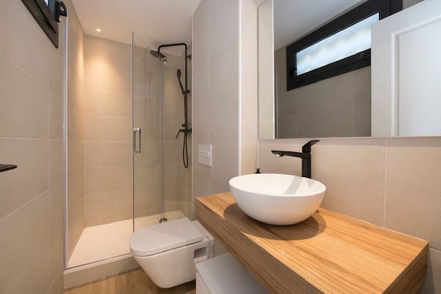 Los baños están aprovechados al máximo ya que cuentan con pocos metros pero tienen todo lo necesario. Los tonos de las piezas cerámicas y de los muebles son cálidos, gracias a la utilización de porcelánico color beige y a la colocación de una encimera de madera natural. Las griferías se pusieron de color negro a juego con la carpintería exterior de toda la vivienda.