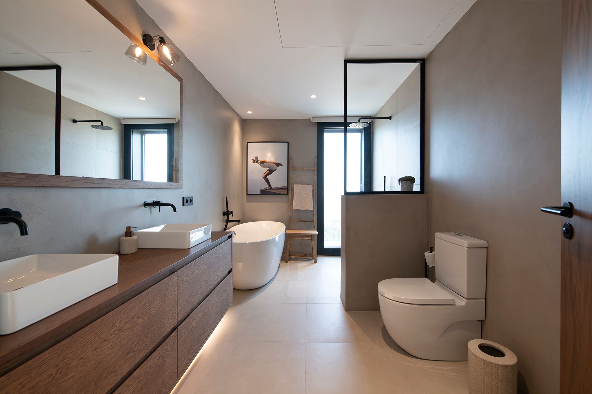 En uno de los baños, de forma irregular, se construyó una bañera de obra revestida con microcemento, que se adapta perfectamente al espacio. Además conseguimos añadir un baño extra a la vivienda, reduciendo ligeramente el salón. Para los nuevos propietarios era imprescindible tener un baño en suite. En los dos baños buscamos combinar la calidez de la madera natural con el mueble de baño suspendido con la imperfección del microcemento en paredes y la dureza del acero cepillado en las griferías.