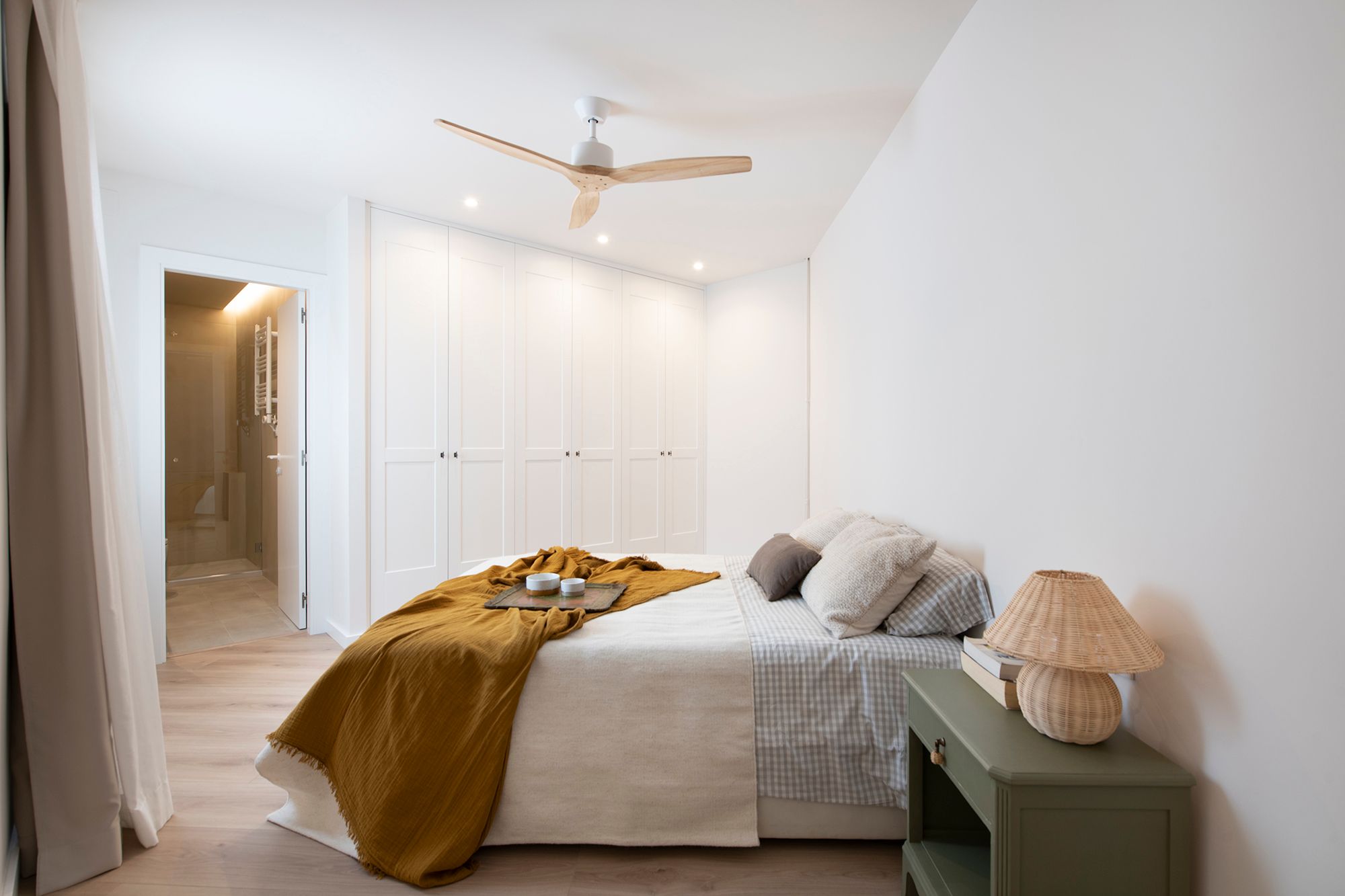 La reforma de este precioso apartamento supuso un gran metro: se trata de un pequeño apartamento de verano de 60m2 útiles interiores, al que pudimos ganar unos metros reduciendo la gran terraza en L que tenía. Trasladamos la cocina a la zona de estar-comedor, para comunicar los espacios y ganar luz natural. La antigua cocina pasó a ser un dormitorio muy bien aprovechado para los futuros hijos de esta joven pareja. En la parte norte de la vivienda, alojamos los dos baños que necesitaban.