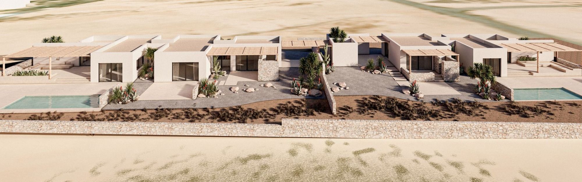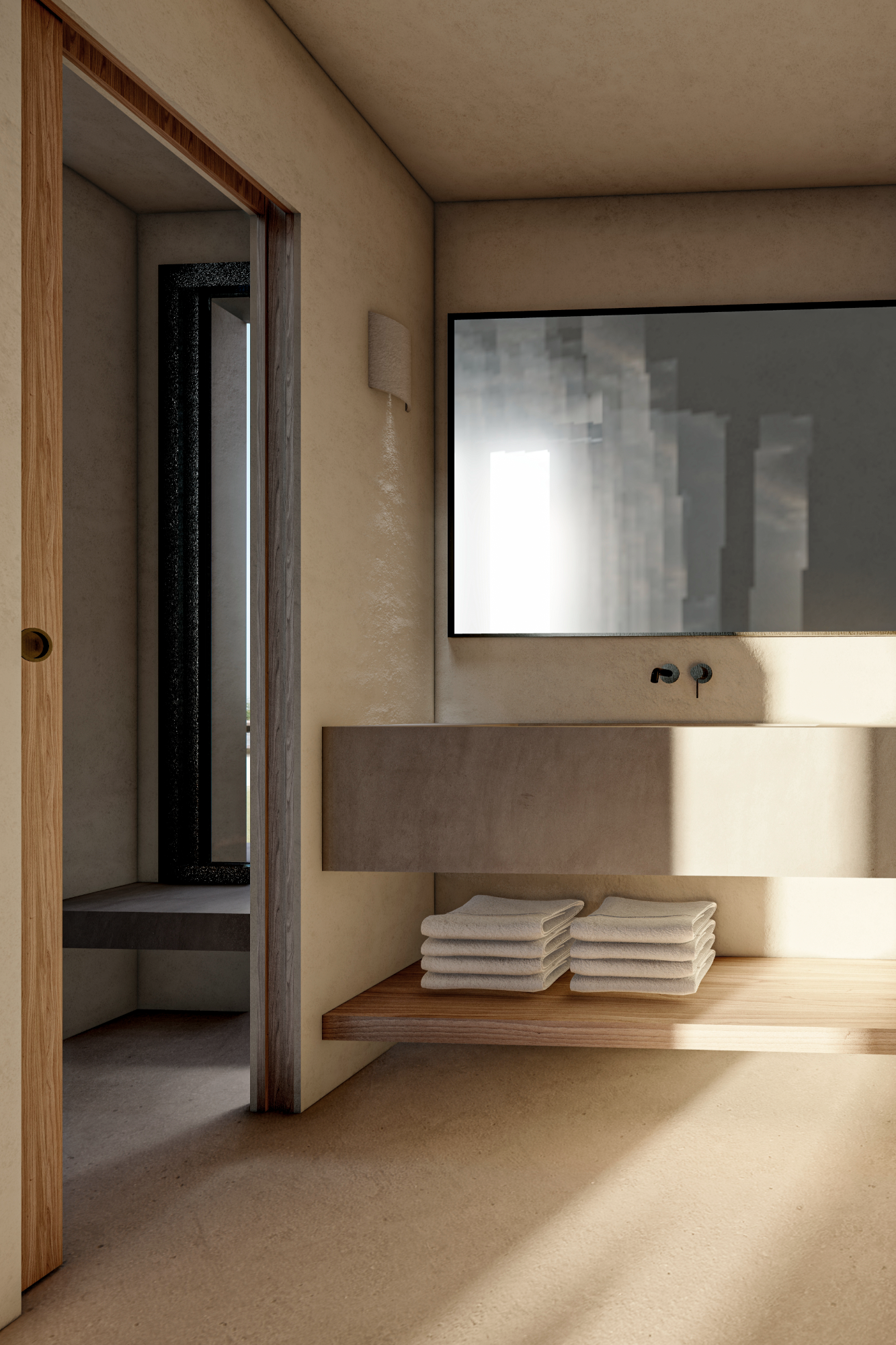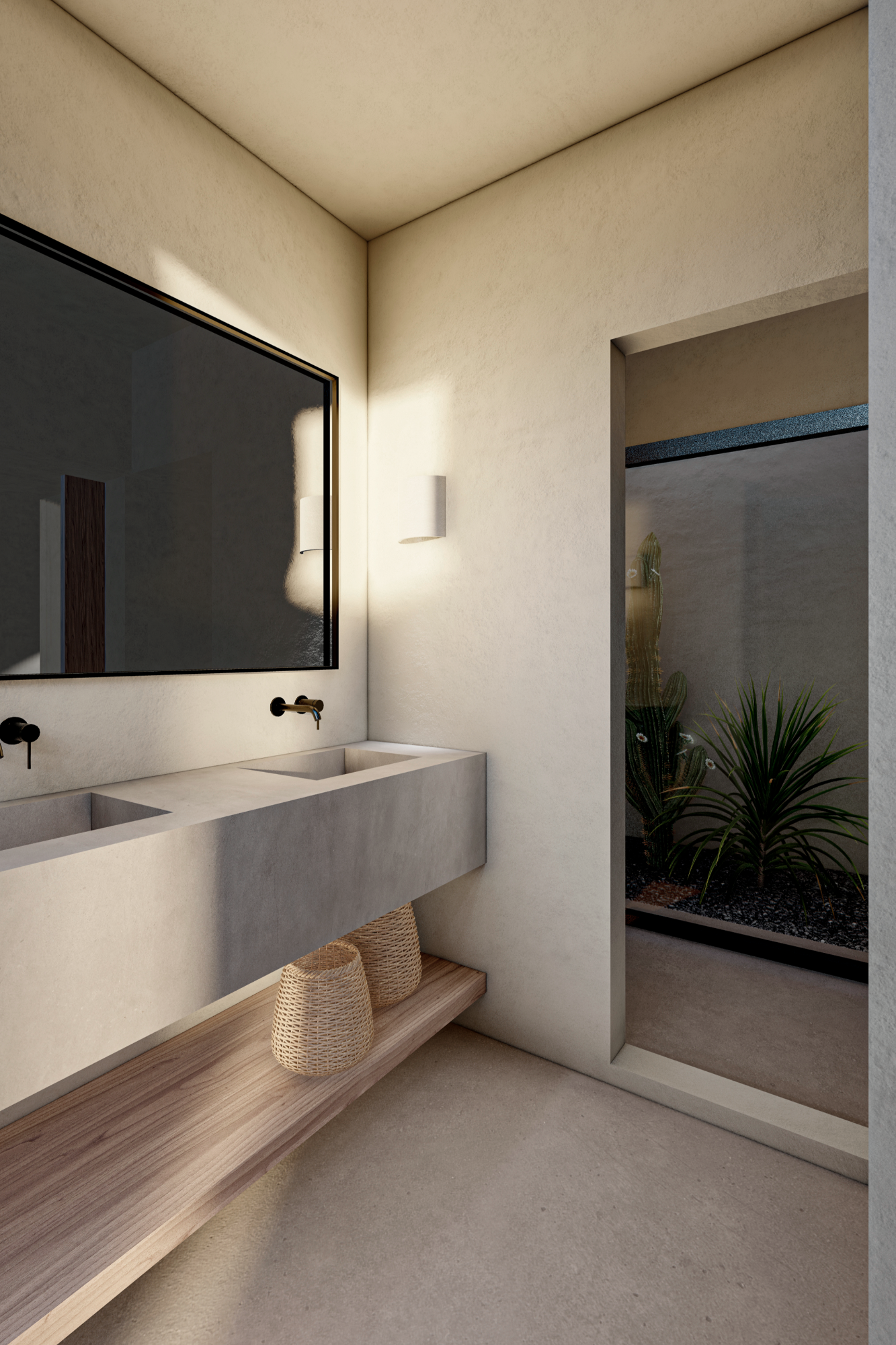 Diseñamos las viviendas a partir de módulos conectados entre ellos, de diferente volúmetria, adaptandonos al terreno y creando patios y espacios privados entre ellos. Para darle el estilo isleño que querían los propietarios, escogimos materiales naturales como la piedra autóctona de la isla, mortero de cal para las paredes, madera para los porches, etc. Diseñamos a medida todos los muebles, para que pudieran ser realizados en obra revestida con microcemento: el sofá, los lavabos, los armarios, etc Gracias a ello, todos los espacios siguen un mismo estilo y transmiten paz, a la vez que priorizamos la durabilidad y resistencia.