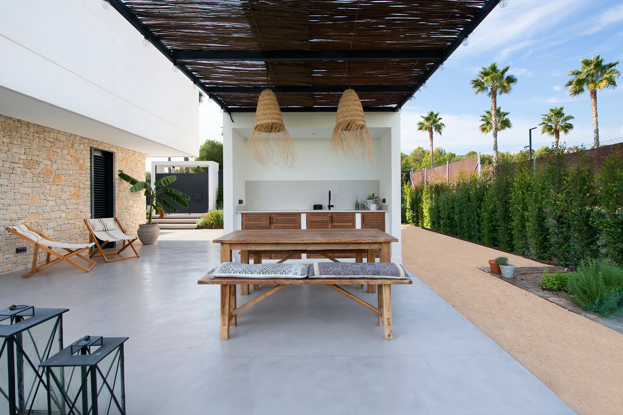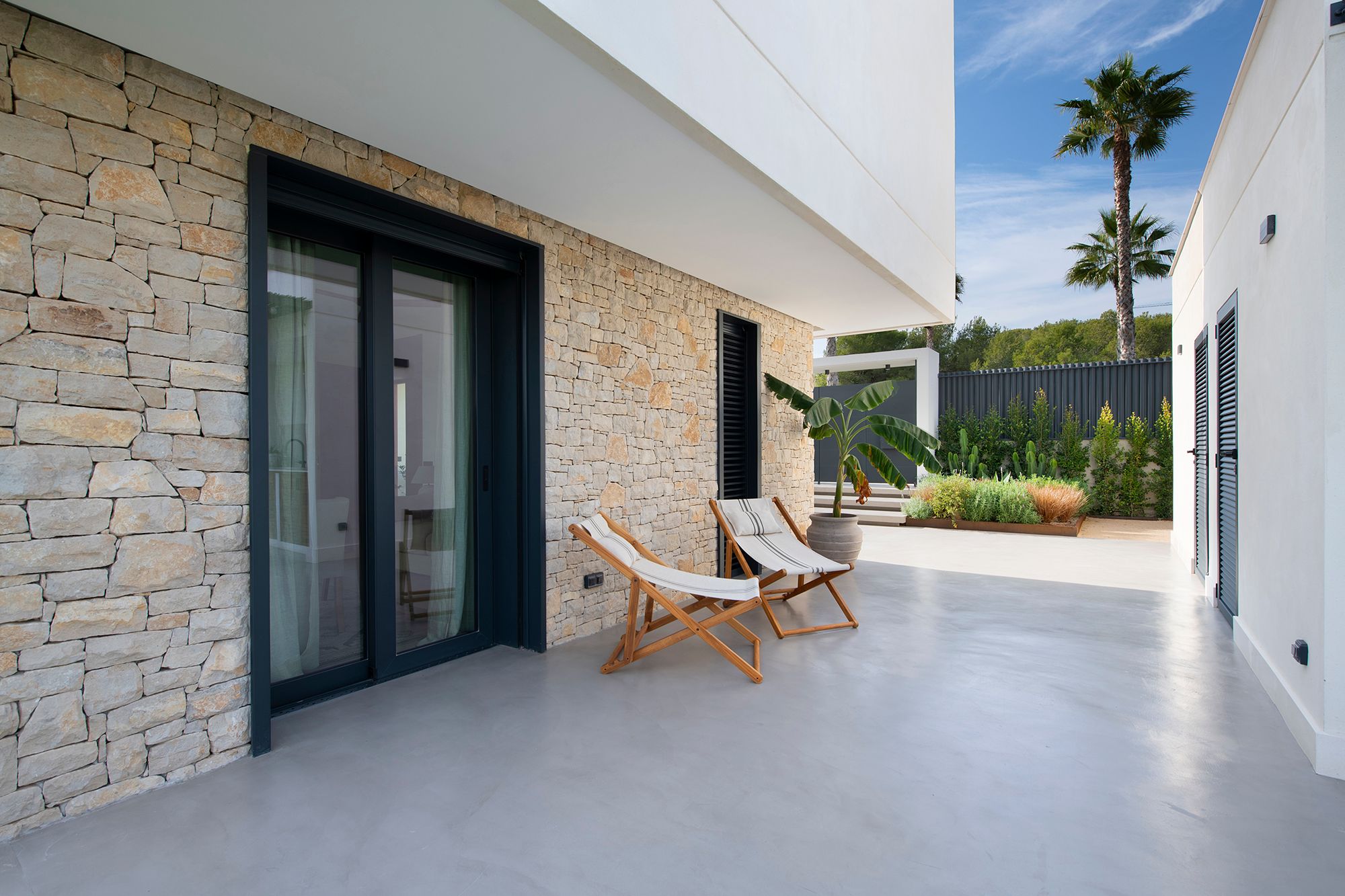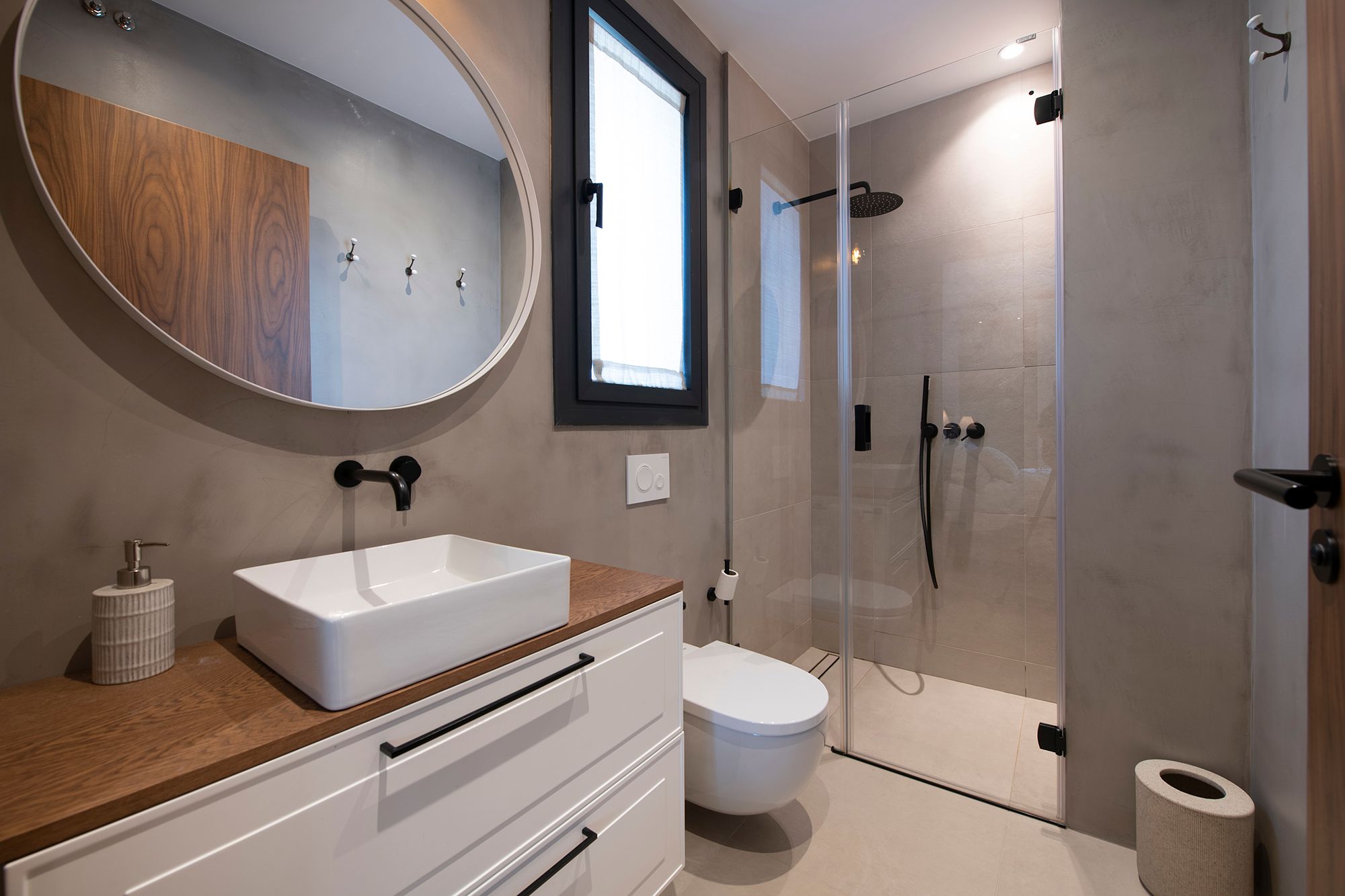 Diseñamos las viviendas a partir de módulos conectados entre ellos, de diferente volúmetria, adaptandonos al terreno y creando patios y espacios privados entre ellos. Para darle el estilo isleño que querían los propietarios, escogimos materiales naturales como la piedra autóctona de la isla, mortero de cal para las paredes, madera para los porches, etc. Diseñamos a medida todos los muebles, para que pudieran ser realizados en obra revestida con microcemento: el sofá, los lavabos, los armarios, etc Gracias a ello, todos los espacios siguen un mismo estilo y transmiten paz, a la vez que priorizamos la durabilidad y resistencia.