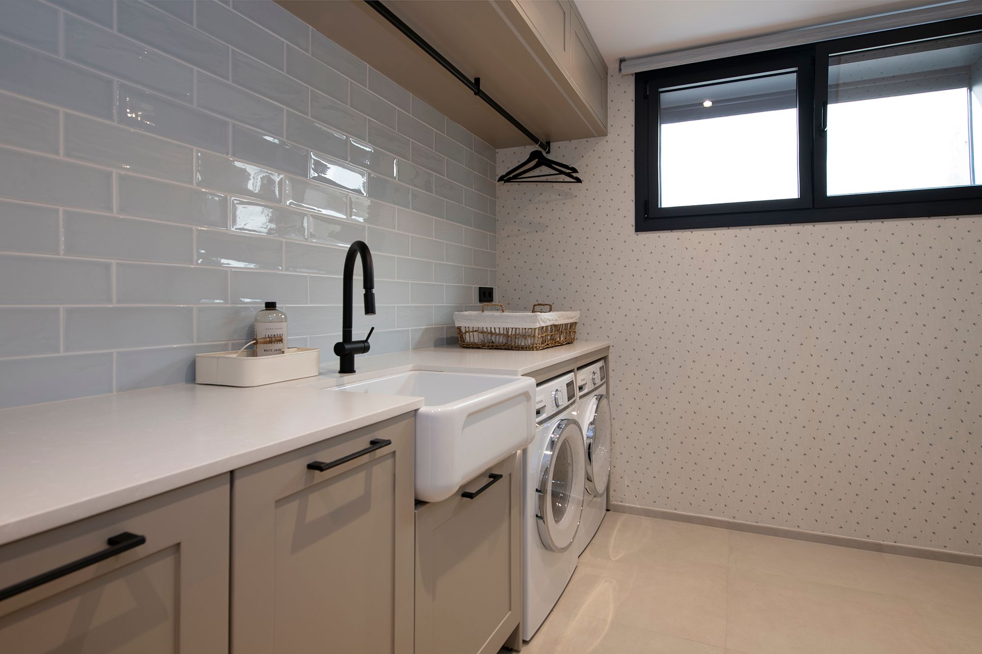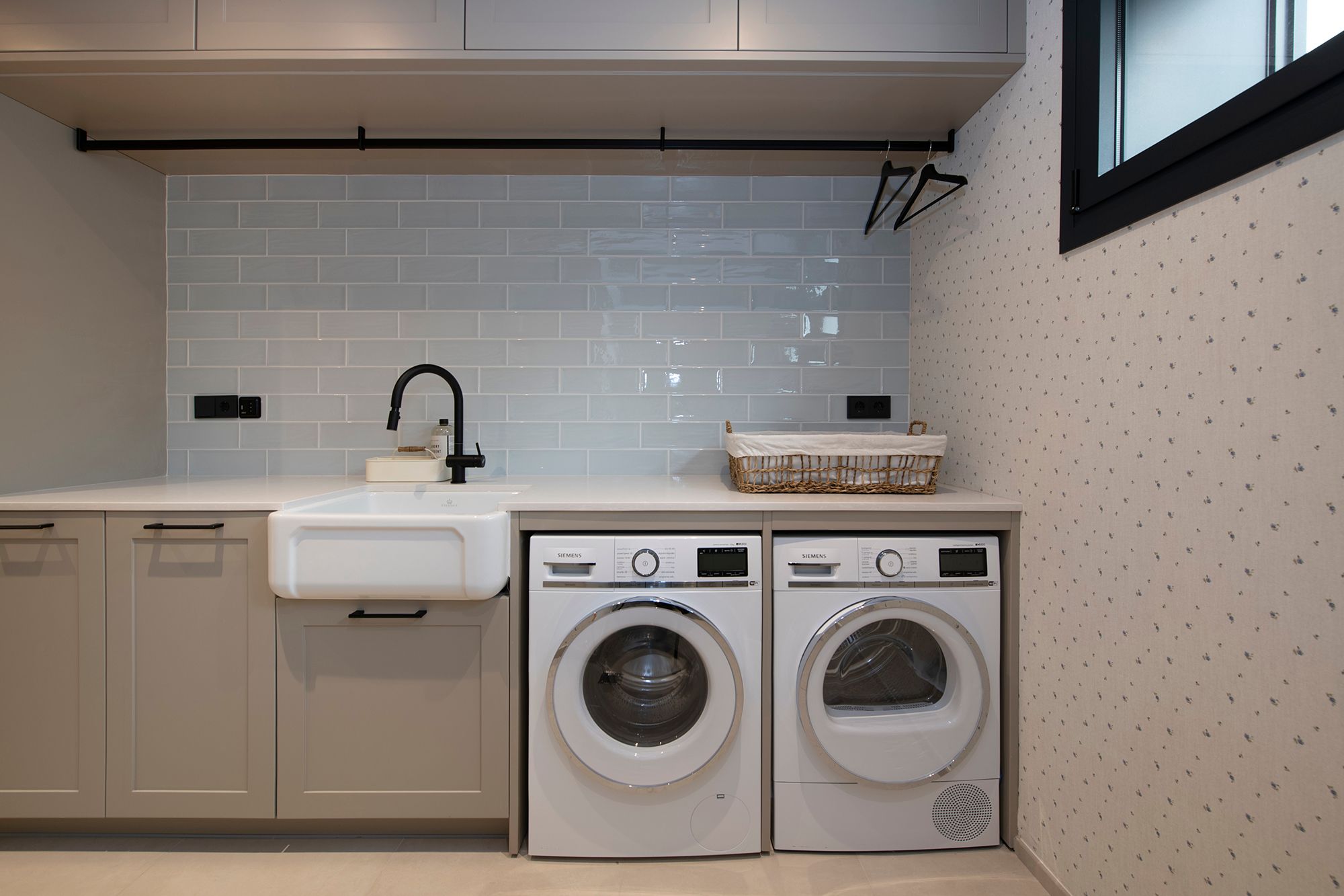 Cada vez más personas quieren un lavadero independiente. En este caso, la vivienda disponía de muchos metros que nos permitieron diseñar un cuarto de lavado de ensueño: mucho almacenaje, un lavadero de porcelana, una encimera imitación mármol y un salpicadero con una pieza cerámica vitrificada que aporta el toque de color que necesitábamos. En cuanto al mobiliario, este lavadero dispone de 2 cajones extraíbles para ropa sucia, una columna para guardar la escoba, aspirador y los productos de limpieza, y una fila de muebles altos bajo la que se colgó una barra que permite colgar la ropa a medida que se va planchando.