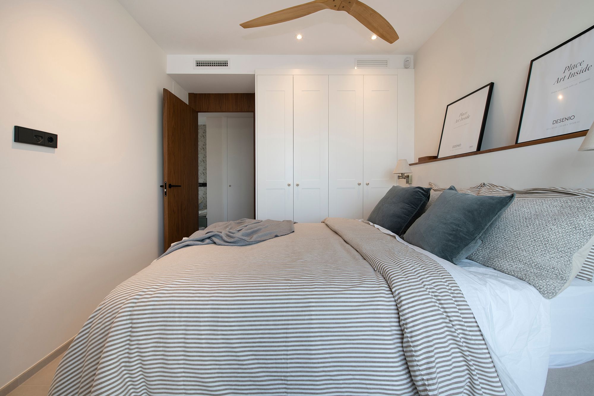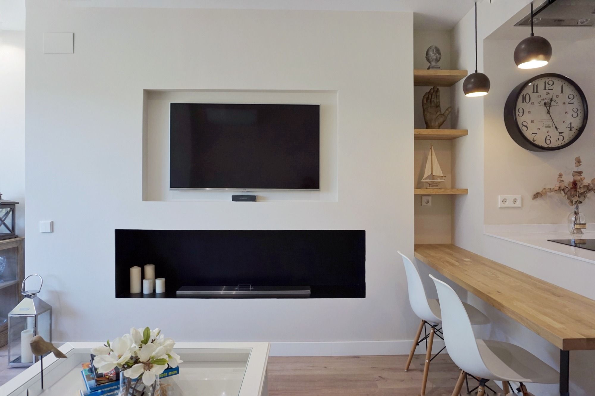 Al tratarse de unos pisos para alquiler vacacional, debimos escoger materiales resistentes, por lo que se instaló un pavimento porcelánico que imita el parquet. Una chimenea de bioetanol divide el dormitorio y el salón, y permite su disfrute desde ambos espacios.