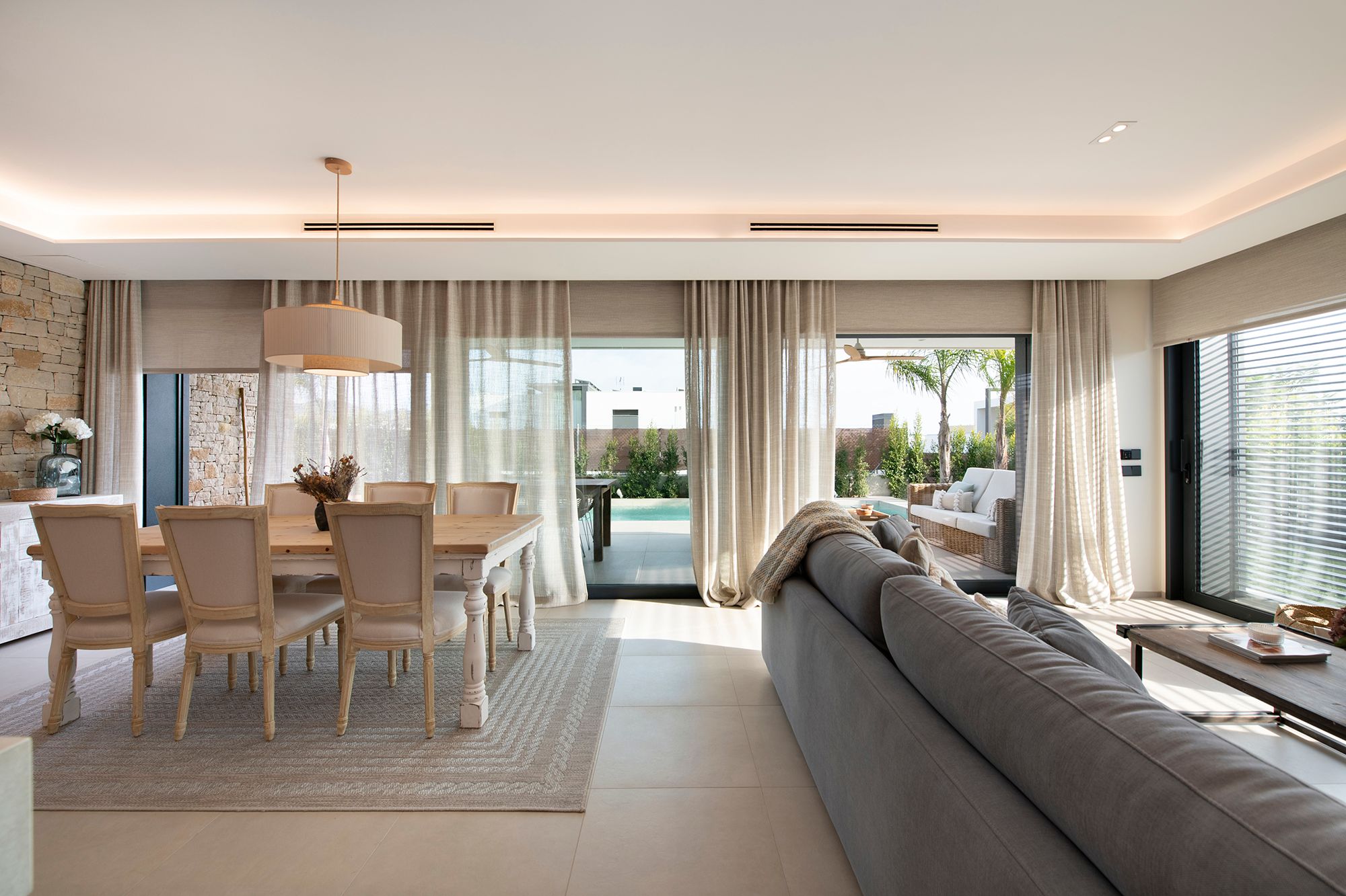 Para el pavimento, aconsejamos utilizar piezas de porcelánico para poder instalarlas también en la terraza y ganar sensación de amplitud. La terraza pasó a ser una prolongación del salón. La carpintería de aluminio color antracita tiene el perfil inferior empotrado a suelo, por lo que se eliminaron los obstáculos y ganamos continuidad en el suelo. La vivienda está situada a pocos metros de la playa, y el porcelánico se comporta excelente frente a las ralladuras.
